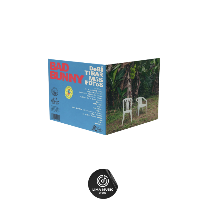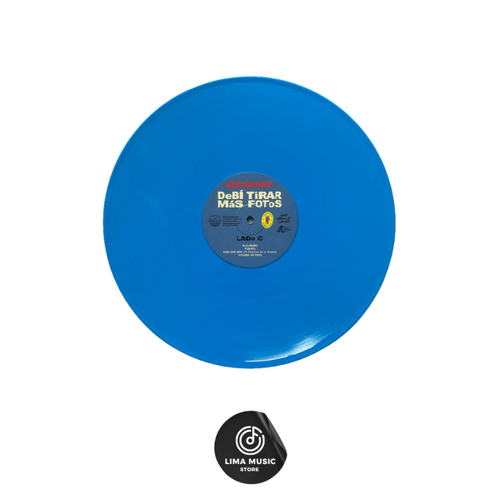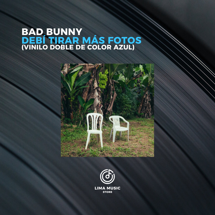 Edición en vinilo doble de color azul del álbum Debí Tirar Más Fotos de Bad Bunny — edición especial en stock ahora en Lima Music Store.